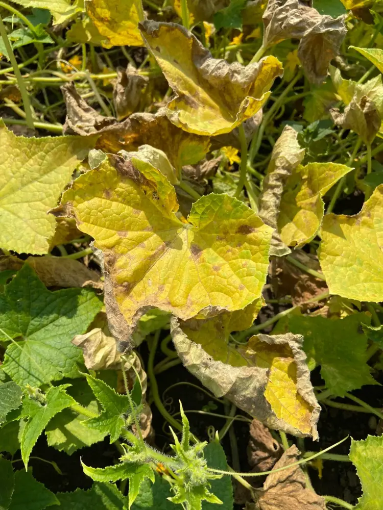 Early downy mildew can be treated with neem oil. Yellow Mosaic and Fusarium Wilt can be prevented through strict aphid control while Cucumber Vein Virus by controlling whiteflies. Excluding downy mildew, most diseases are incurable and the plants must be disposed of. Do not put infected plants in your compost bin!