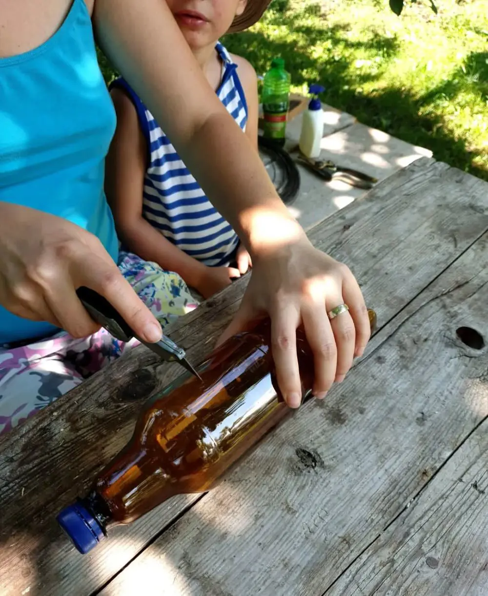 Therefore, you should cover the solution with a cellophane and poke holes. Poking the right-sized holes can be tricky since they need to be large enough to allow the flies to enter but small enough to prevent their escape.