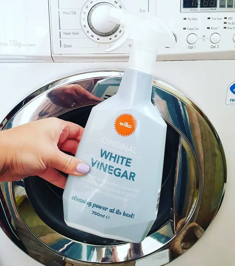 Avoid stronger vinegar solutions such as herbicidal or cleaning vinegar and use 3-5% diluted white vinegar which should be diluted even further by mixing in water in a 1:1 parts ratio. Furthermore, always check your machine's manual to see whether cleaning agents such as bleach and vinegar are explicitly advised against.