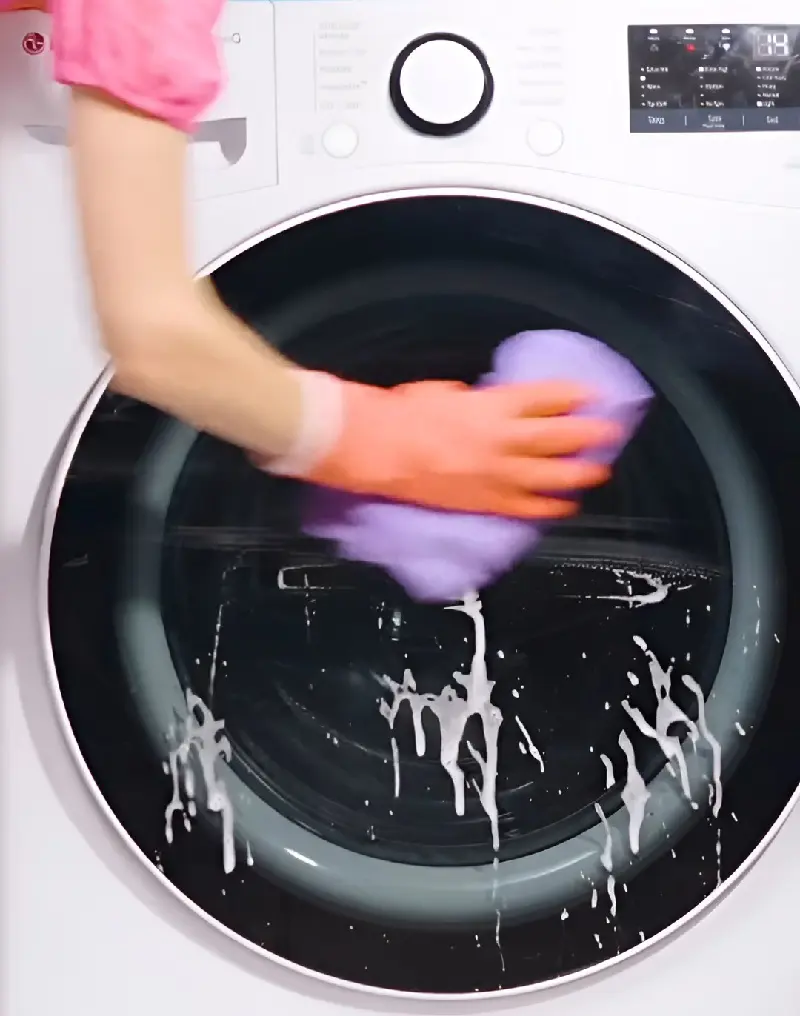 Once the washer is dry, take your water-distilled white vinegar mixture and spray it along the entire length of the washer gasket-or what some people more correctly call a rubber door seal. Let it sit for a minute or so; afterwards, just wipe it off with a microfiber cloth.