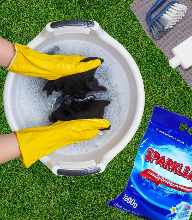 Afterward, rinse the piece of clothing thoroughly to remove any trace of any flammable and non-flammable pre-wash liquids before doing one final through wash in the washing machine with detergent.