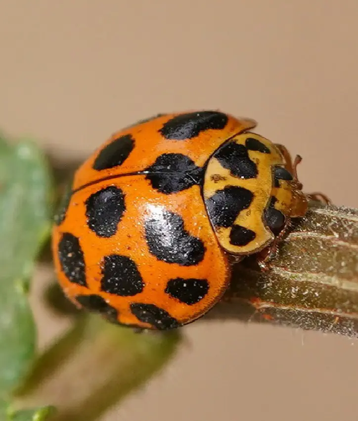 The spots are arranged in a striking pattern, which helps distinguish it from other ladybug species. This type of ladybug is less aggressive and is less likely to invade homes in large numbers. It primarily feeds on aphids and other small insects in gardens and fields, making it a beneficial beetle for pest control.