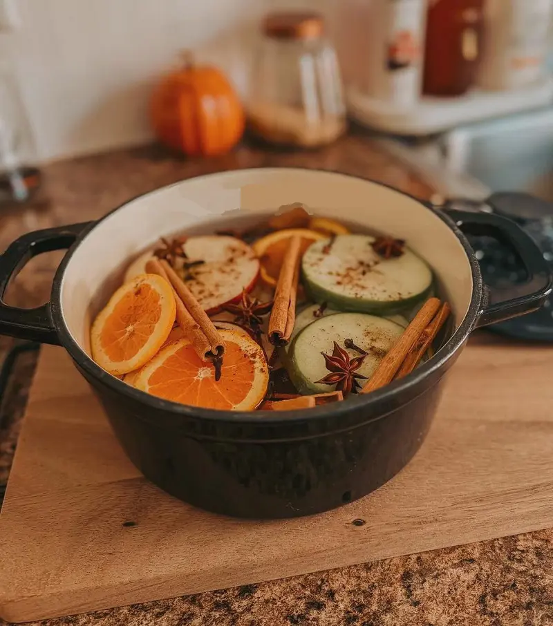 Fill a pot three-quarters full of water, and on medium heat, boil it with some peels of orange or apple along with cinnamon sticks. Once the water comes to a boil, turn down the heat to low and simmer the pot to slowly release the refreshing aroma around your house while making sure to add water as needed every half hour.