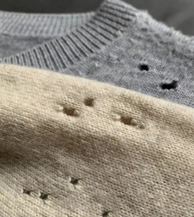 Carpet beetle larvae are known for damaging clothing by chewing through sweaters, scarves, coats, and blankets, often creating large clusters of holes. This damage pattern differs from clothes moths, which leave smaller, scattered holes.