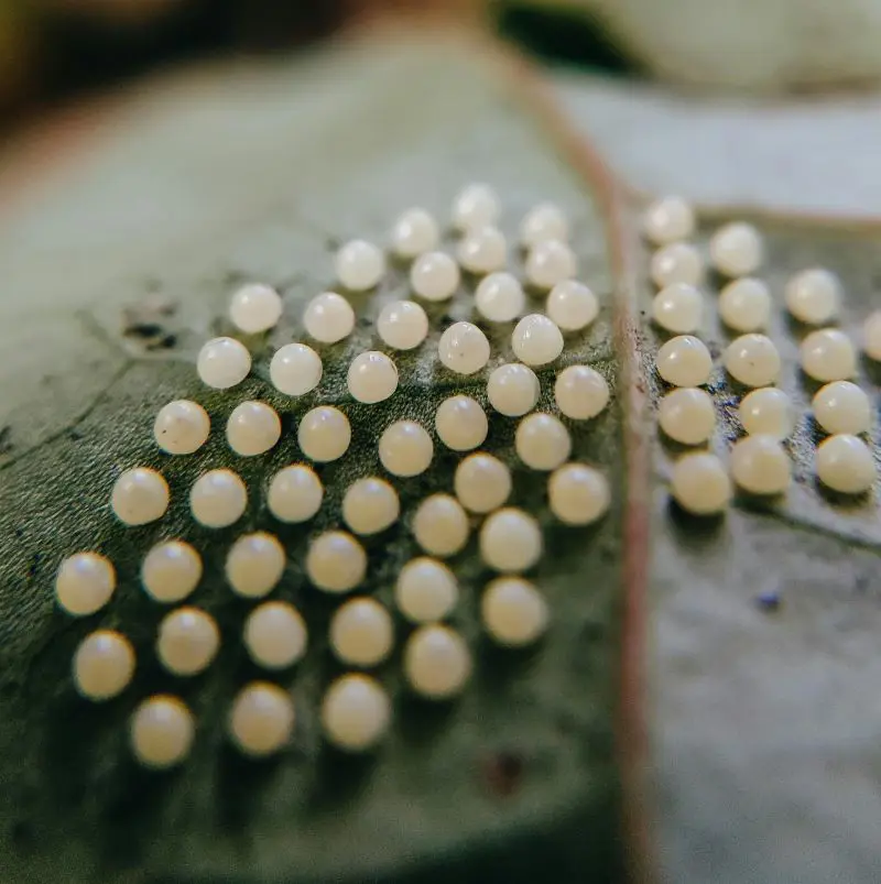 The eggs of the moths and butterflies are visible on the lower side of the leaves. Its appearance is usually small, round, and stuck on line segments. They are yellow, white, and other colors depending on the species of caterpillar. Removing the egg-stricken part of the plant or destroying the eggs can help to prevent fertilization of the egg.