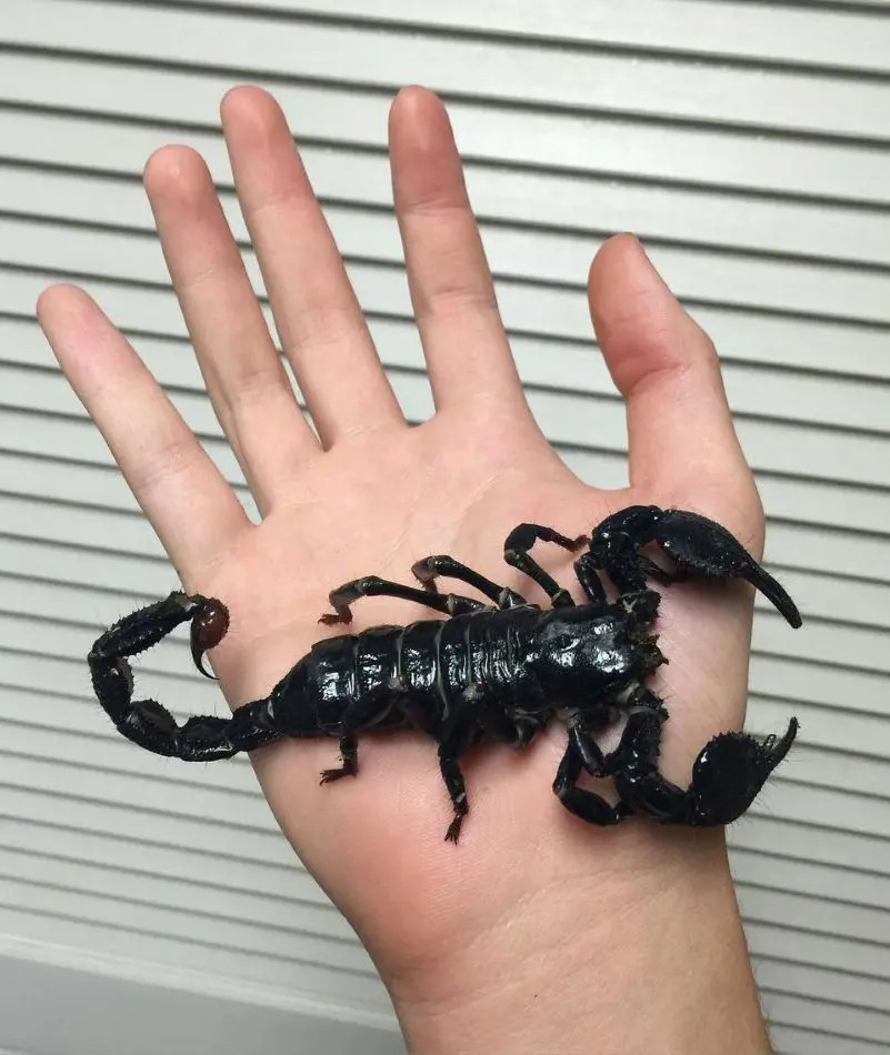 Even though they are pretty big, they are usually not aggressive, and their venom is relatively mild, causing only minor irritation like a sting or swelling. These scorpions like humid, tropical places and hide under leaves or logs during the day, coming out at night to hunt for insects.