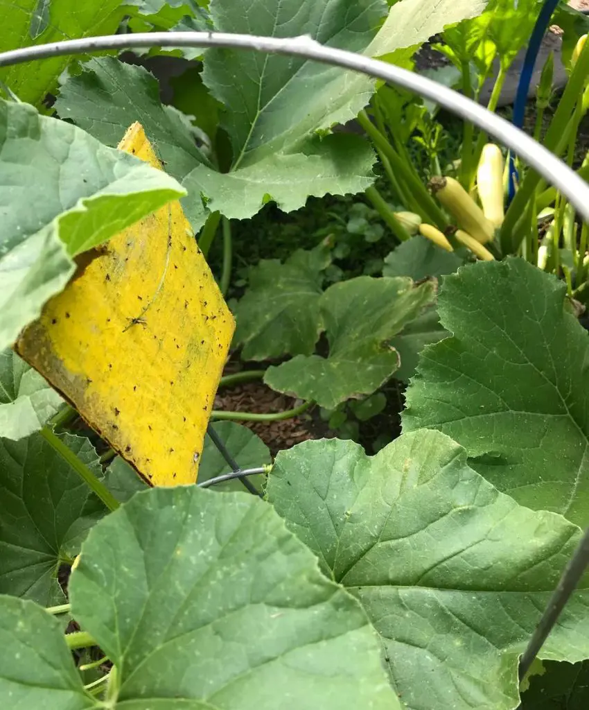 Adult squash bugs are trapped and collected by yellow sticky traps. Set these traps around the squash plants in order to catch the bugs before they lay eggs. The brilliant yellow colour is very appealing to many insect pests and once they come into contact with the sticky surface, they are trapped.