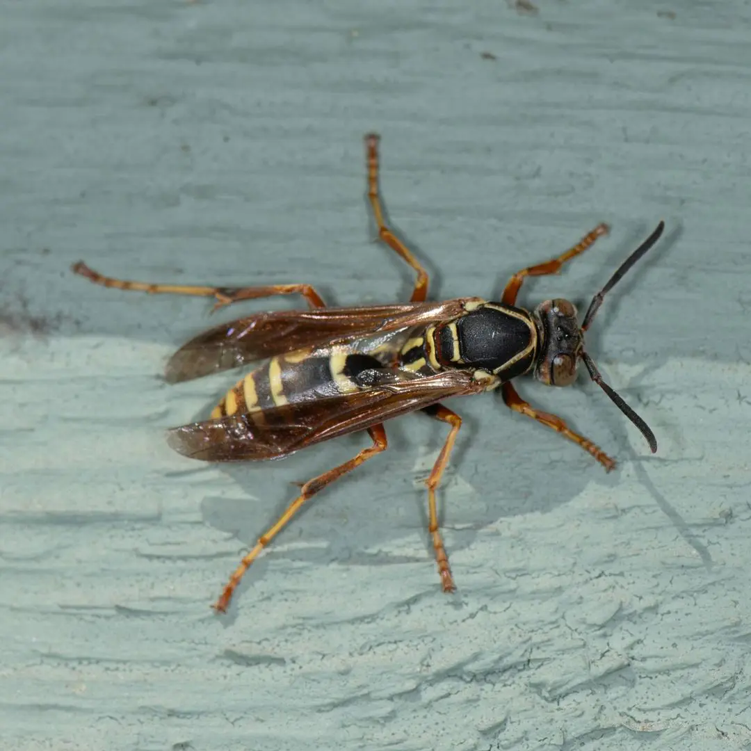 Paper wasps are 0.75 to 1.25 inches with a defined waist and long gels that dangle when they fly, like a mosquito. Their abdomen is pointed at the tip with black or brown with yellow markings. They have black wings that lie flat rest.