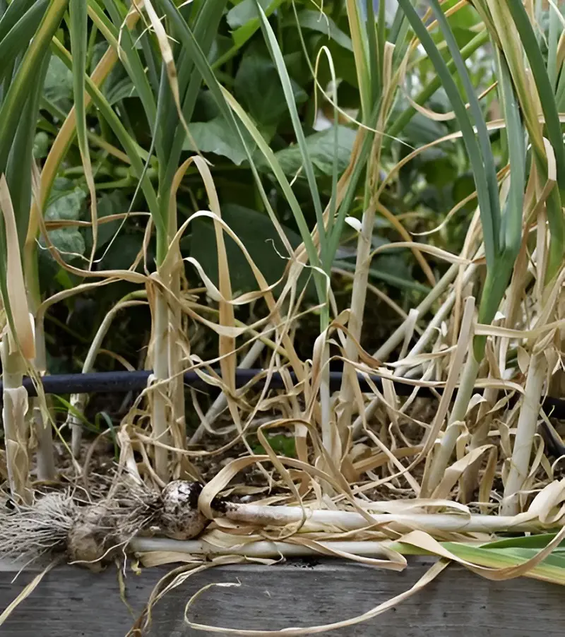 When the bottom leaves begin to turn dry and yellow, harvest time is near. During June or July, when the lower leaves turn brown, dig up a few bulbs to check their progress. For hard-necked varieties, it's best to harvest when 40% of the leaves are brown while soft-necked can be harvested with just 2 brown leaves.