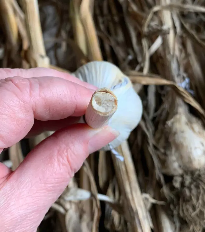 You can also remove the first layer to remove the soil but don't remove too many as they help keep the freshness. Again, do not wash the bulbs. Look at the interior of the cut stem, they should be uncracked and fully white for a well-cured garlic.