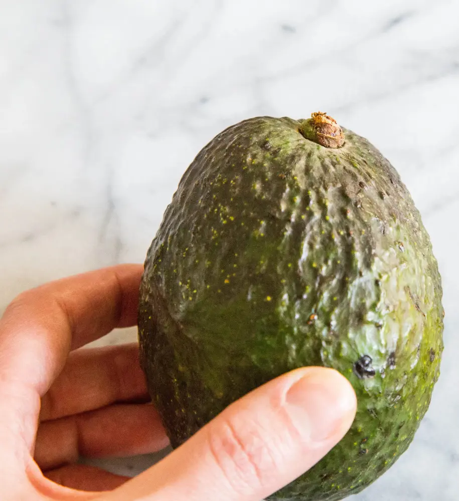 Avoid poking it and instead place it in the palm of your hand instead of using your fingertips and squeeze. This method helps check the firmness of the fruit without damaging it. If the avocado yields to pressure, it is ripe. If not, it might need a few more days, but if it feels too soft or squishy, it may be overripe