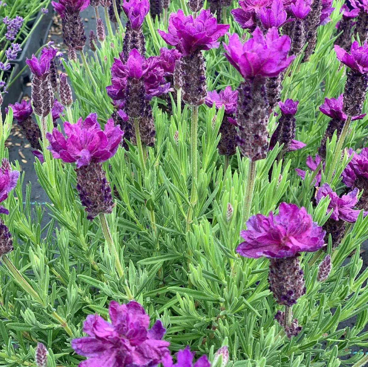 Lavandula Stoeches, also known as French or Spanish lavender, is the least hardy among lavender varieties, typically blooming early in spring. It features short, full flower spikes with open petals at the top, setting it apart from other lavender types.