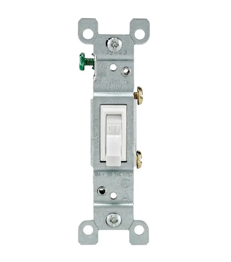 This is the most common type of switch found in homes and it is used to control one device such as a light fixture, electric outlet, or garbage disposal system. On the side, you can see two screw terminals excluding the green grounding screw terminal.