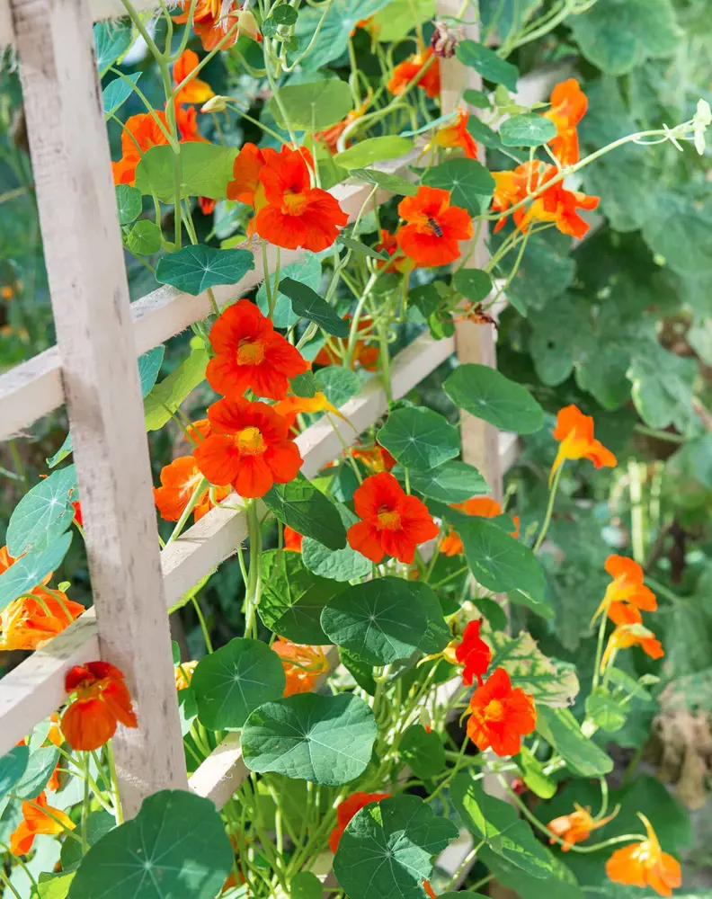 Nasturtiums are not just for aesthetics as they are completely edible flower plants mostly used as a garnish for your tomato salad, don't forget to throw in some cucumbers and carrots as well. Nasturtiums and tomatoes make a great pair when grown together as they benefit each other's yield and growth.
