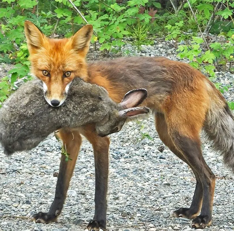 Hares are bigger and faster than rabbits but equally become prey to the fox. Even though hares are tricky to catch due to their speed and agility, foxes are relentless and cunning hunters. A hare is full of protein and will keep a fox fed for a few days.