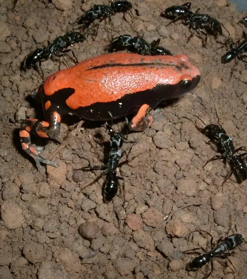 You don't have to worry about the frogs when they are ant-terminating, some of them may have a strong bite or sting but they're nothing that the frogs cannot handle. If the frog is being overwhelmed, they can simply jump away from danger as well.