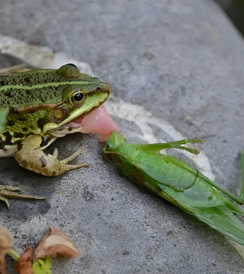 Grasshoppers may be able to jump 50 times its height but the tongue of the frogs can uncoil faster than the grasshoppers can react and they provide a substantial meal so the frog may be thanking their lucky stars.